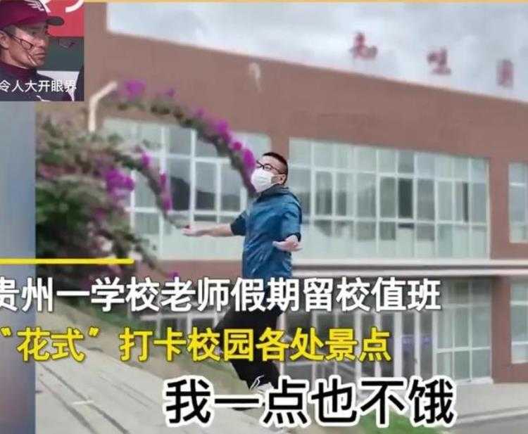 还有一位老师国庆放假一个人留守学校值班,跳着舞把学校各个地方都打卡了一遍,隔着屏幕也能感受到他的快乐。