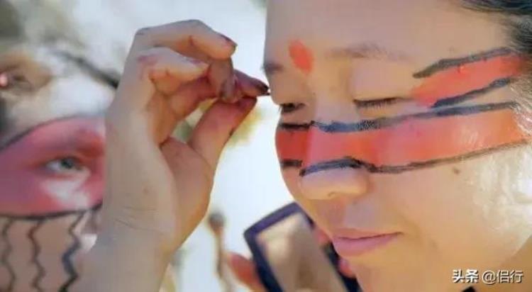朝阳升起,部落里的人开始化妆。红色的水果汁、黑色的木炭,就是他们的化妆品。