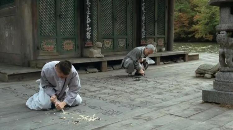 老和尚在地板上写下佛经,吩咐小和尚拿着杀妻的刀一笔一划的刻下来。