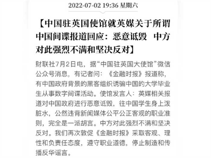 此次的事件发生,充分展现了一些国外势力对我国恶意抹黑行为的态度,对此我国也要表示强烈的谴责,将一些不实情报炒作成中国间谍的案件市无端恶劣的行为,中国的这一次回应,也彰显了中国在国际事务处理中,维护自身权益的形象和坚定的决心。