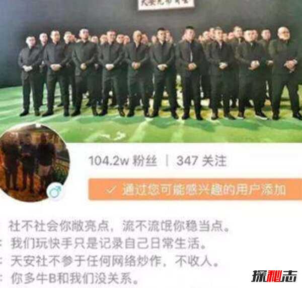 天安社是由天安永泰、天安永兴、天安永斌、天安永义四人一起发展创立的,这个社团并没有在民政局登记注册过,也不是一个正常社团会取的名字。天安社在快手火的时候,有着数百万忠实粉丝,不过也被网友们贴上了低俗、浅薄等标签,有着黑社会性质的天安社在2017年3月已经被北京警方彻底打掉。