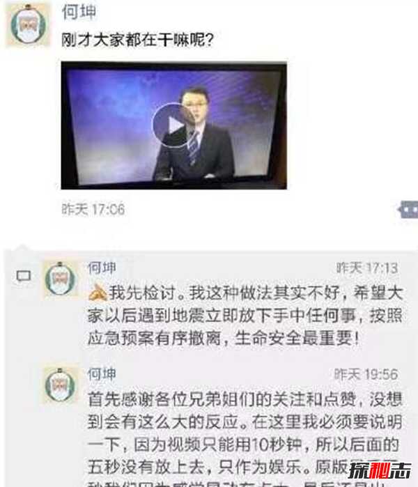 何坤:生命安全最重要,我感觉我这种做法不是太好,希望大家以后遇到地震立即放下手中正在做的任何事情,按照应急预案有序撤离。视频后面少了5秒我们撤离避险的视频,容易让人误认为发生地震我们仍在工作,所以后来我发了道歉情况说明。