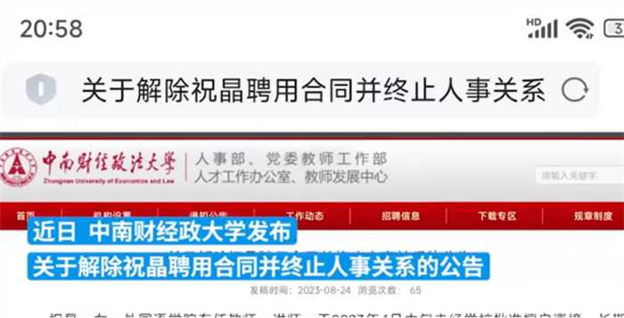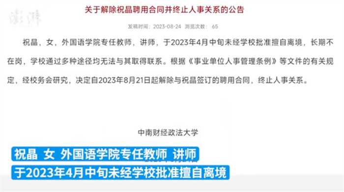 近期,一位高校女教师因擅自离境导致被学校解聘的消息在全网引起人们的关注。8月24日,中南财经政法大学在官网发布通告称,学校女教师祝晶是外国语学院的专任教师,在2023年四月份中旬未经学校的批准擅自离境,并且长时间不在岗,学校通过多种途径仍无法与其取得联系,最终根据事业单位人事管理相关条例的规定,经学校校务会的研究决定,从2023年的8月21日开始解除与其的聘用合同,该通知在曝光之后让很多网友都为之诧异,为什么这位前途光明的女教师会选择擅自离境。