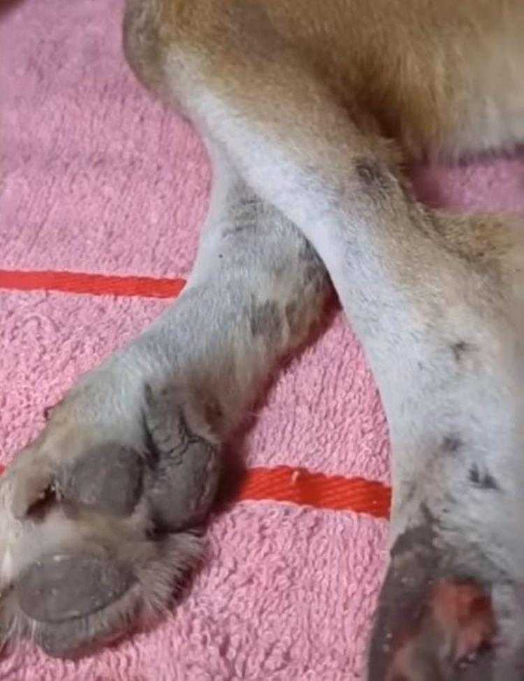 狗狗的身体上有很多擦伤,这是它在柏油路上拖着自己行走时弄破的。毛巾上还有很多从狗狗下体流出的血液,大家猜测它或许是怀孕了,然而刚经历了车祸,胎儿的情况不容乐观。