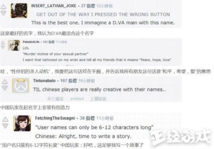 因为有人翻译了一下那些被封掉的国人ID,然后老外纷纷被那些脑洞大开的ID给征服了。什么性感荷官在线发牌(Sexy Dutch online licensing),点赞的都是我亲爹( Upvote me and you're my father ),其中“吃屎不忘拉屎人”更是被评年度为最佳ID。