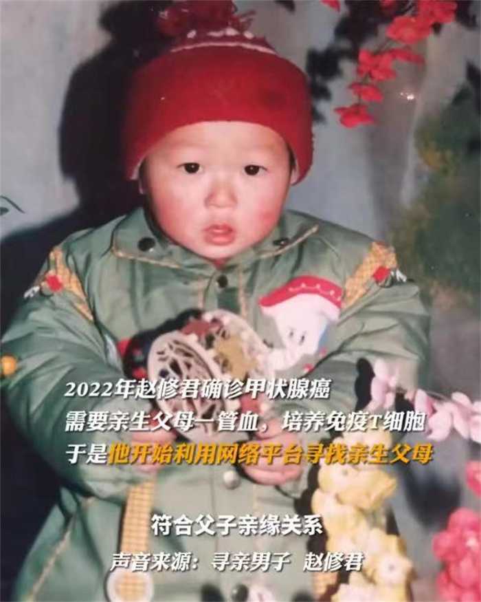 赵修君在今年1月份接受采访时表示:“我患癌了,想找到亲生父母,需要他们的一管血救自己。”赵修君今年32岁,经过警方的DNA数据分析,与四川多个乡镇村周姓家族或许有关系。赵修君因为癌症已经转移,非常迫切的需要父母的血液进行就诊。想要通过网络媒体的方式能够获得更多人帮助,快速找到自己的亲生父母。