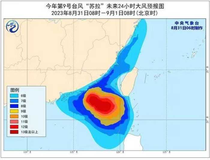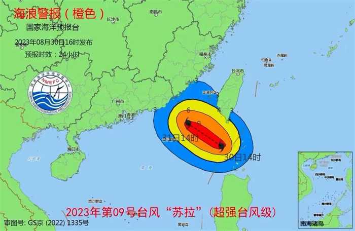 第9号台风“苏拉”已经成为超强台风。国家海洋预报台在8月30日下午发布海浪橙色警报以及风暴潮蓝色警报。在8月30日夜间及8月31日白天,巴士海峡以及南海东北部会出现7~11米的狂浪,台湾海峡南部会出现5~7米的巨浪。预计在8月30日下午至8月31日下午,福建福州到广东揭阳沿海会出现30厘米到80厘米的风暴增水,福建省提升防台风应急响应为二级。