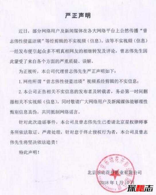 对此,曾志伟方发表声明称:网传所谓“曾志伟性侵蓝洁瑛”视频系经剪辑的不实信息,正告相关不实信息的发布者及转载者,务必第一时间删撤相关不实视频(信息)。