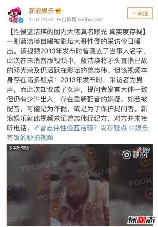 一、蓝洁瑛被曾志伟性侵全视频过程最近的娱乐圈可以说是处于水深火热之中了,各种猛料都被一些耿直”的人们所曝光,小编还在想哪天会不会曝光何炅私生子的事情呢!据说就在最近,有网友称早上看见一个消息被震惊,卓伟爆出视频,蓝洁瑛在视频中亲口承认,她被曾志伟和邓光荣强奸!