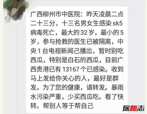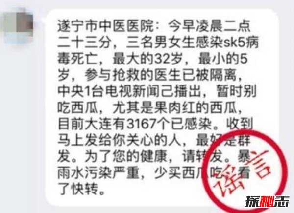 导语:最近朋友圈开始流传一则消息:据说在湛江中医院紧急进入了三位感染SK5病毒的患者,这几位患者都是因为吃西瓜所以才中毒的。这则新闻在中央一台也有所报道,所以大家最近最好远离西瓜。消息一出很多朋友圈都被刷爆了,搞得人心惶惶的,那么这件事情是真实的吗?所谓的sk5病毒真的存在吗?和探秘志小编一起了解一下。