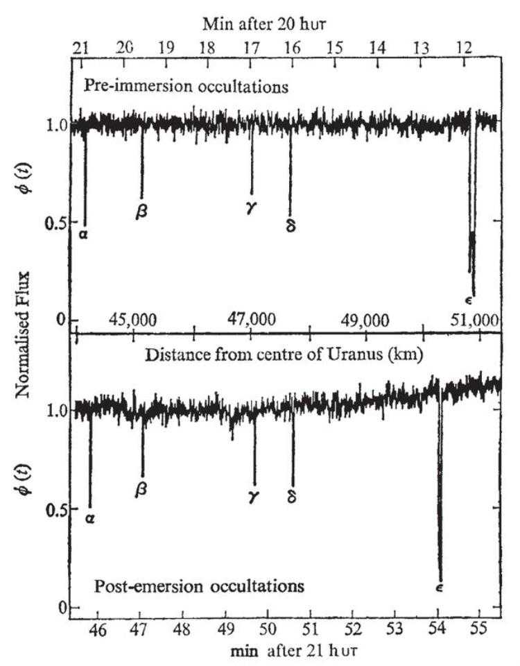 1977年3月10日,两位天文学家和一位数据分析师使用柯伊伯机载天文台,飞到12500米的高空去观测天王星掩蔽恒星SAO 158687。他们原本只是想研究星光通过天王星大气之后的光谱变化,这样就可以分析天王星的大气成分。
