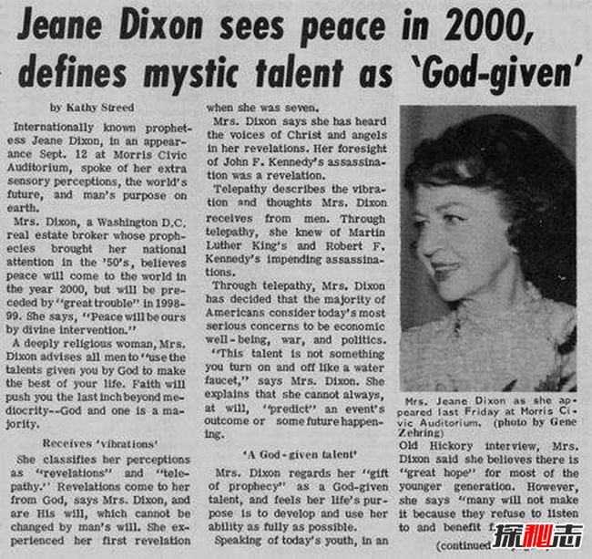 在人类十大超能力中有一个就是预言能力,虽然很多人对其嗤之以鼻,但是还是有一定可行度的。这位有名的女预言家是美国人,她叫珍妮狄克逊出生在1904年,在她小时候就展现出过人的预知能力。据说有一次她让自己的父亲注意镶了黑边的信,当时父亲十分疑惑,但是十多天后从德国寄来了一封有关她爷爷去世的信件。