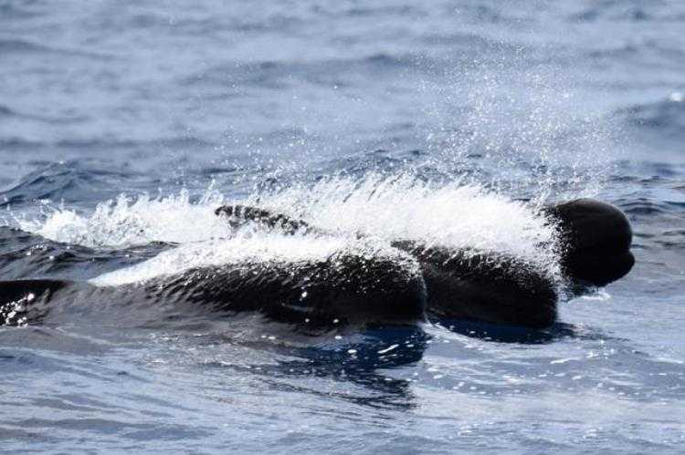 布雷默湾正在试图驱逐虎鲸的长肢领航鲸,从身上的水花可以看出速度极快。