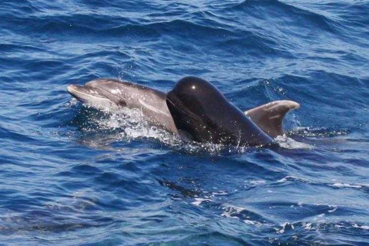 当然领航鲸和其他鲸目的关系也不都是充满火药味的。事实上领航鲸经常和其他鲸类同游,这头长肢领航鲸幼崽就在各自家人的监护下和一头比自己年龄更大的幼年瓶鼻海豚一起愉快玩耍。