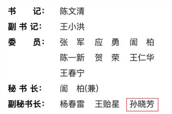 9月4日,媒体报道中央政治委领导层再次添加一位女性成员,根据公开资料显示,此次出任中央政法委副秘书长的孙晓芳曾经长期在中央政法委工作,而且还担任过中央政法委法制建设部副主任等多个职位,2017年二月份,孙晓芳带队到上海市人民检察院调研,2018年四月份,孙晓芳率队前往浙江省诸暨市人民检察院调研,今年4月4日,孙晓芳与中央政法委机关党委常务副书记的身份接受央视采访。