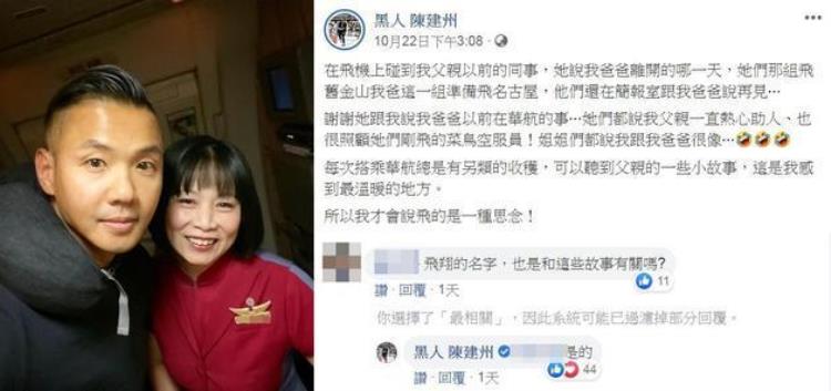 据台湾媒体报道,“黑人”陈建州的父亲陈培元曾是中华航空公司的资深乘务长,不幸在1994年的名古屋空难中殉职,所以陈建州每次搭机时总会不经意地想起父亲,飞机成为他与爸爸之间的连接。近日他在搭机时,碰巧遇到父亲生前的同事,对方和他分享见到爸爸最后一面的情景,让他格外有感触。