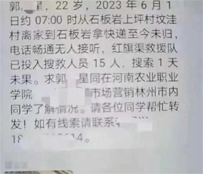 林州市石板岩镇上坪村的22岁女孩郭某某在6月1日上午独自走山路到镇里取快递。但是单趟只需要走两小时的路程,郭某某直到晚上都没有回家,家里人十分焦急拨通对方的电话,但是没有人接听,焦急的亲友们沿着山路寻找,到这里的时候发现本来应该被取走的,快递也没有拿到,这个女孩就这样悄然的失联了,在失联之前也没有携带身份证,而且没有异常举动,在第2天晚上家人寻找无果之后,就在派出所报警了。