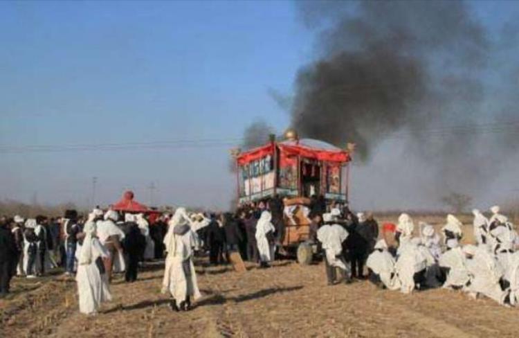到了选定的路口,孝子对着纸轿纸马跪下烧纸叩头。烧完纸后,抬着油桶的人将柴油浇到纸轿纸马上,然后点燃焚烧,熊熊燃烧的大火照亮夜空,死者灵魂也就随着燃烧的轿子和高头大马升向天空。待火势稍小,孝子们奔过去从火上跨过,跳得越高表明以后越兴旺发达。孝子跨过火堆后要快速往家走,路上是不能回头的,不然会有魂灵追随着回家,很不吉利。其他人自然也跟着一起回去,到此整个送程仪式就算结束了。