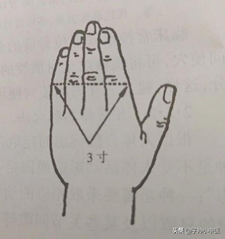 ③横指同身寸 :以中指的中节横纹处为准,四指为三寸