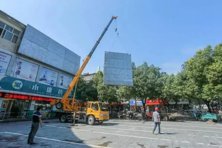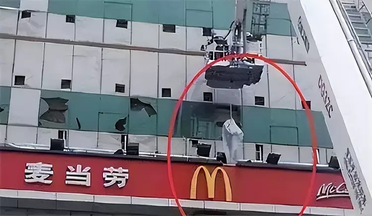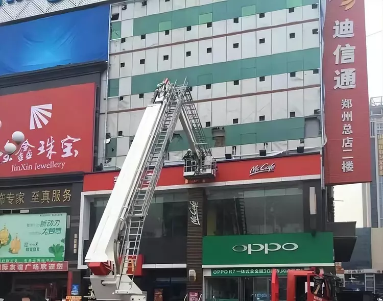 广告牌的位置在4栋楼的高度,在广场和居民楼仅30厘米的夹缝中。维修师傅的操作难度挺大,他们用了云梯爬上去工作。