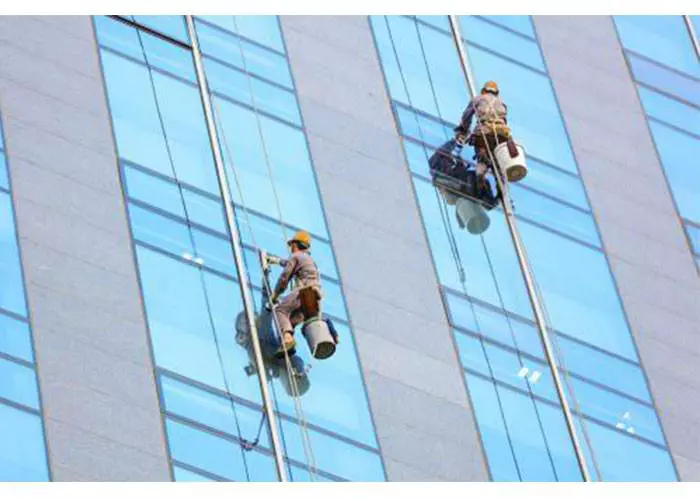 2015年5月21日郑州友谊商场正在进行维修工作,几个工人负责将被风刮坏的广告牌维修拆卸。