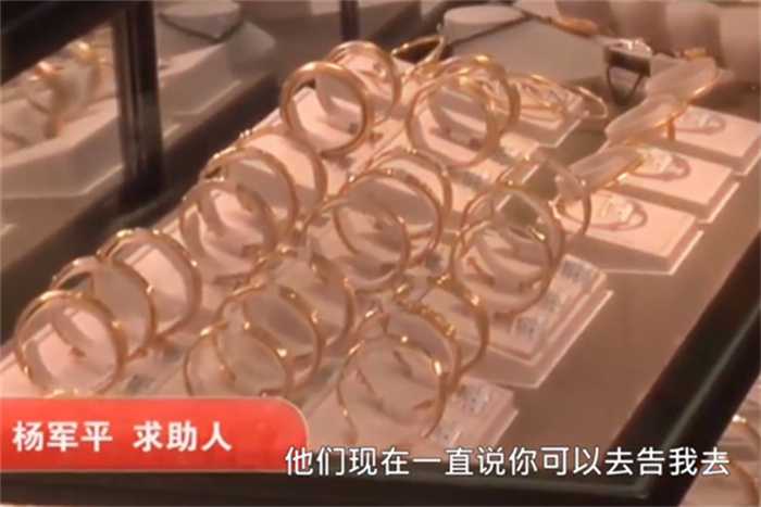 拿着这个手镯的发票和假冒伪劣的手镯来到了当初购买金手镯的这家珠宝店,要求珠宝店退货并且退款,但是珠宝店却根本不承认自己卖过这个金手镯,甚至还和杨女士说你随便去告,杨女士自然也被珠宝店的态度给气坏,把这件事拍摄成了视频上传到了网络上。
