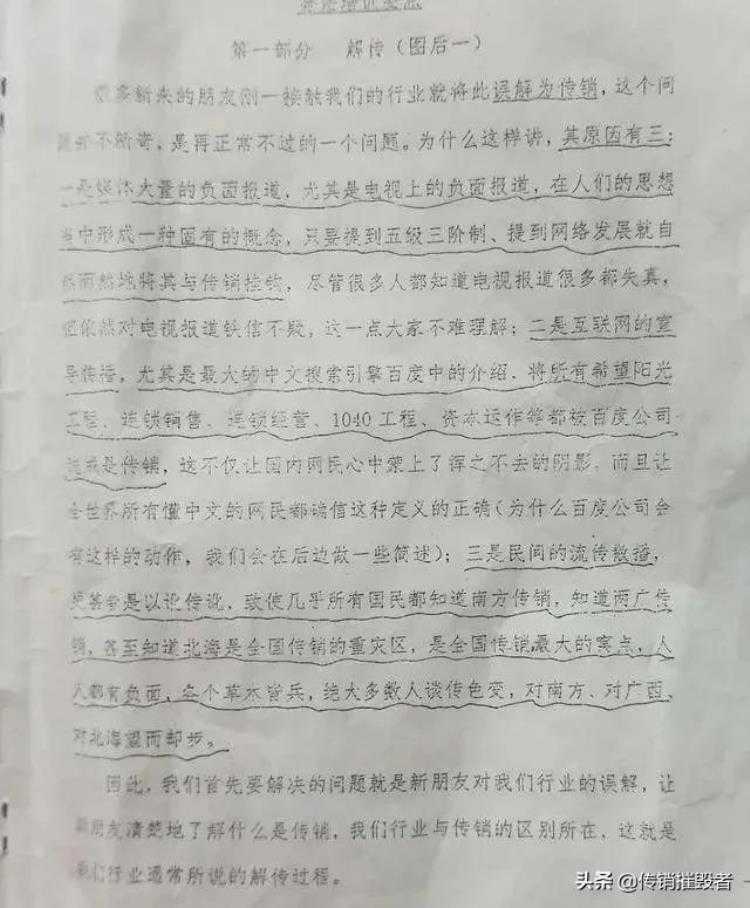 在1040传销中要学习的资料有很多,比如怎么谎言邀约,开心门,怎么给新人上课等等。就拿上图来说,这是1040传销内部的讲课培训资料的部分内容,俗称三班。1040传销人员在通过素质课(所谓的八大心态)后,就要学习讲一班工作,成为传销讲师,也就是当新人来的时候,可以给新人去上课洗脑。从上面的传销内部资料可以看出,1040传销人员学习还是挺下功夫的,用笔将一些关键的地方作下划线,然后将这些内容死记硬背下来,通过不断地模仿练习,最后讲课给新人听。