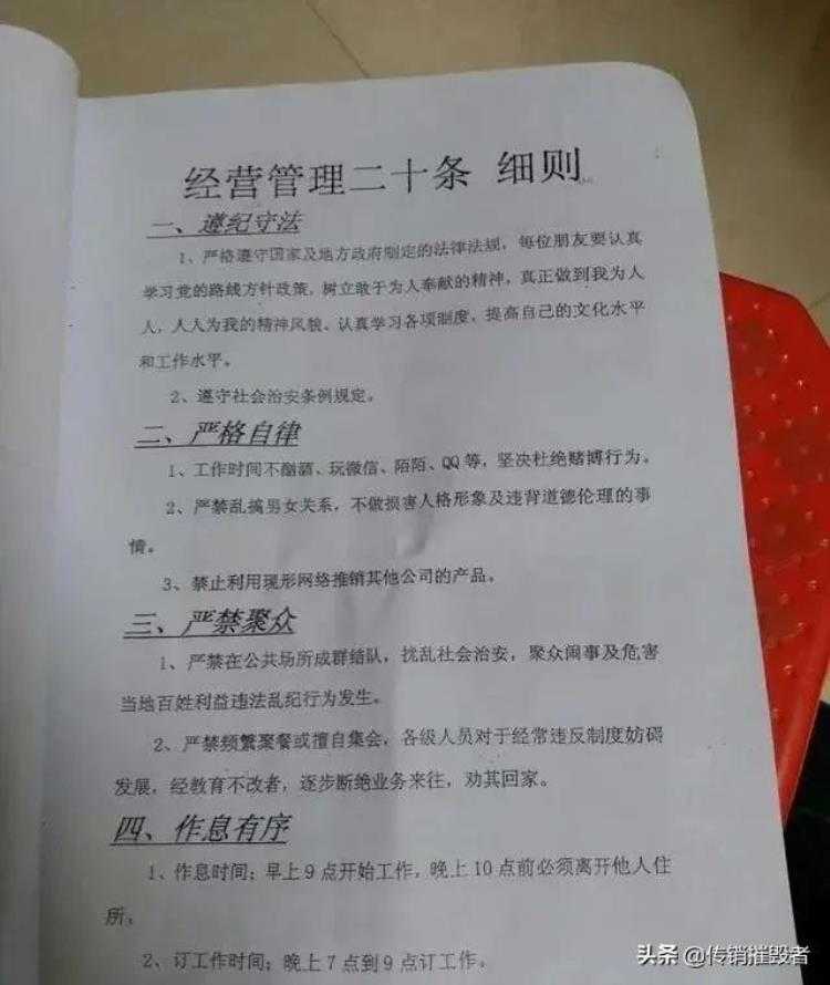 自律在1040传销中被称为行业的第三大保障,他们认为有效的自律可以帮助他们早日成功,早日达到老总级别,实现自己的千万美梦。那怎么做到自律呢?在1040传销内部有一套自律的规范,被称为《生活经营管理二十条》,如上图所示。每一个新人被骗进1040传销后,都要进行自律的复制,因此1040传销内部很重视自律,对于违反自律的人就会赶走,即所谓的“提前出局”。因此,关于自律,1040传销内部有个说法叫不自律早死。