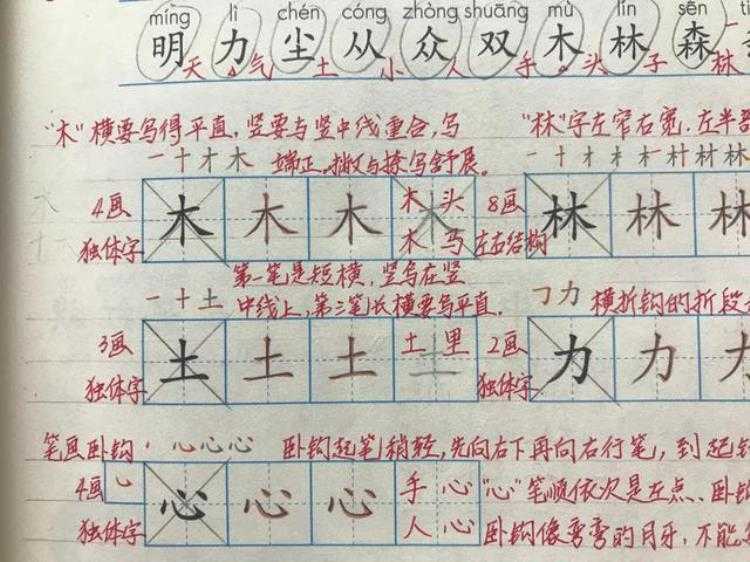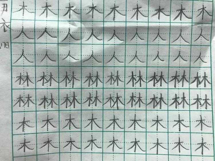 “林”就是两个木组成的,在观察这个字的时候,除了要观察笔画书写的位置,还要看看变化。