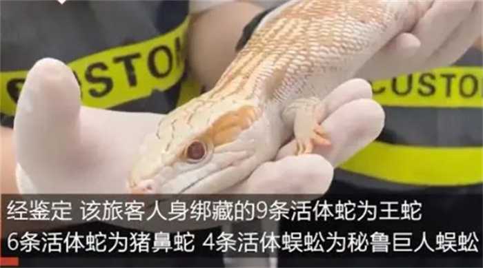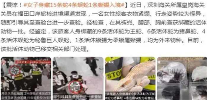 近日根据媒体报道深圳海关所属黄冈海关关员在福田口岸旅检进境渠道,发现有一个女性旅客身穿的衣物非常紧绷,而行走的姿势和常人相比非常怪异,随即海关人员就引导这名女子到查验台进一步查验,根据海关人员检查才发现在这名女子的腰部、裤兜、胸前查获绑藏一大批活体动物。其中有九条活体蛇都是王蛇,有六体活体蛇是猪鼻蛇,还有四条活体蜈蚣是秘鲁巨人蜈蚣,有一条活体蜥蜴是柔蜥属蜥蜴,这些活体动物都是外来物种,截止到目前为止被发现的这批活体动物已经移交到了相关部门处理。
