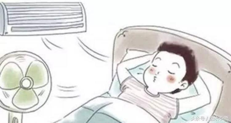 风扇伴眠,风扇对着人体不断吹风时,由于流动空气的传导和 对流作用,身体吹到的一面体表热量迅速敢失,皮肤血管和汗腺随 之收缩,吹不到的一面皮肤温度仍然较高,表皮血管及汗腺仍是舒张的,因体温中枢来不及调节,就会引起机体生理功能紊乱,出现 头昏头痛、乏力懒散、腰酸背痛、鼻塞流涕等症状。