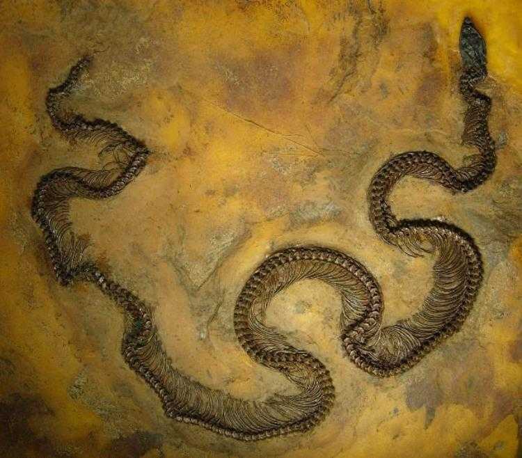 文特斯教授的朋友是位化石收藏家,多年来已经收集了数百块古生物化石。在朋友家里,文特斯教授受到了热烈的欢迎,饭后他还和朋友一起谈论化石。文特斯教授注意到客厅摆了一块较大的蛇类化石,长约80厘米,头部呈弯曲转态,不过尾部却很宽,与他见过的蛇类化石不太一样。文特斯教授对这块化石很感兴趣,于是朋友就慷慨地赠送给了他做研究。