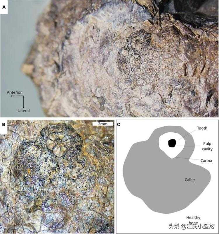 嵌入牙齿的SAM-PK-11490引起了古生物学家的兴趣,当他们观察了嵌入牙齿的外形并测量了尺寸之后发现这枚牙齿竟然来自于同类!难道这只动物是被同类杀死的?