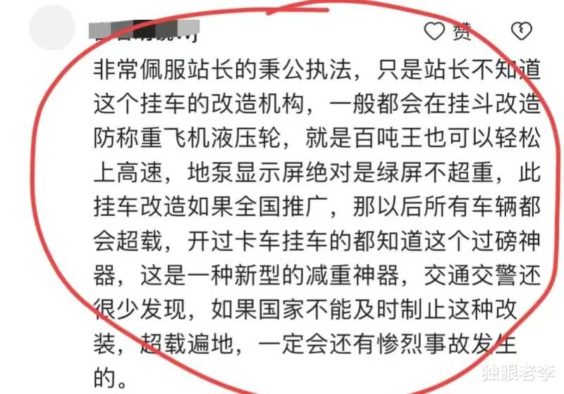 有专业人士对此解读说:一个正常的货车,三个轴之间的数据差异不会超过2吨,但这位司机的货车着重差异到了4吨,有异常是毫无疑问的,地磅显示不出来,但有经验的工作人员一眼就能看出来,绝对是在三轴上做了手脚。