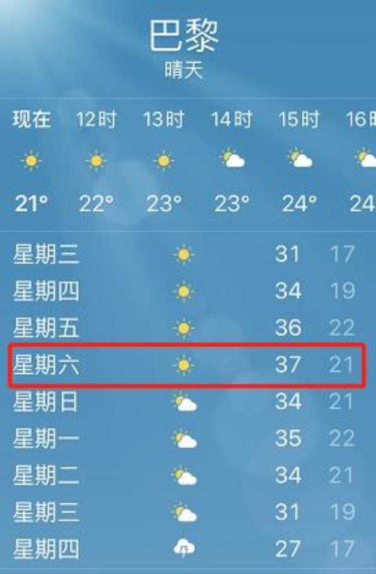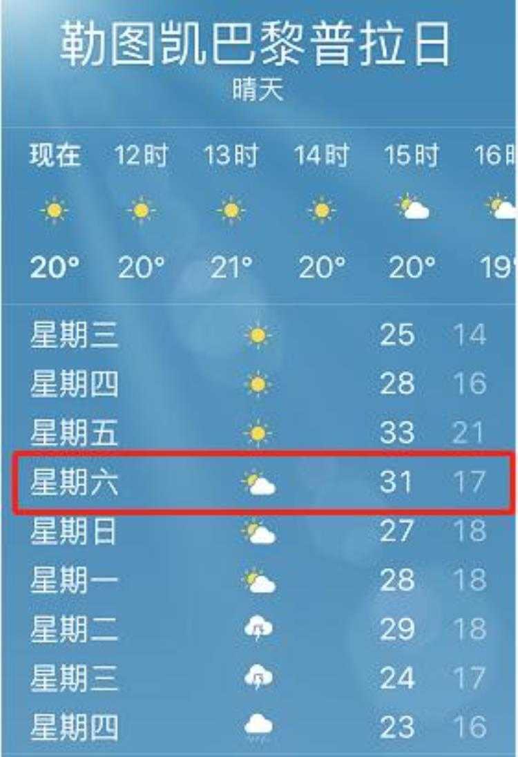 再来看看本周六当地天气,温度适宜,比巴黎凉快多啦,