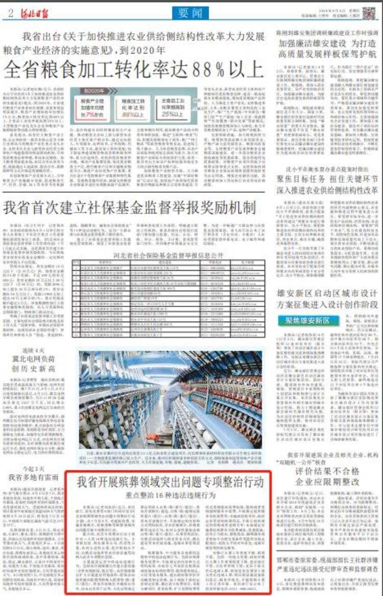 近日,省民政厅、省发改委等9部门共同印发《河北省殡葬领域突出问题专项整治行动方案》,从7月至9月,对超标收费、实施价格欺诈、价格垄断等殡葬领域突出问题开展专项整治行动。