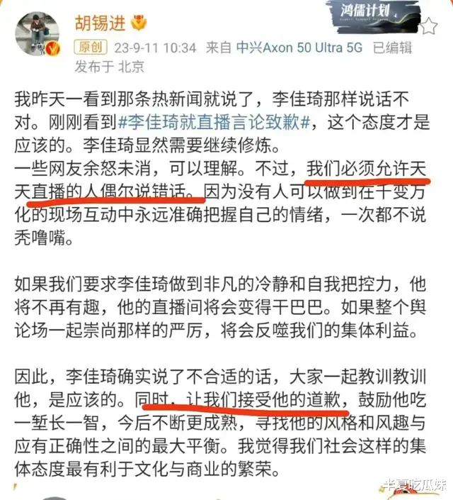 不得不说胡锡进确实是老奸巨猾,他把李佳琦的故意恶评偷换成偶尔说错话,