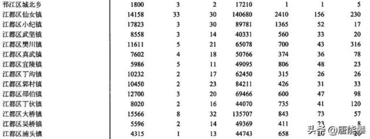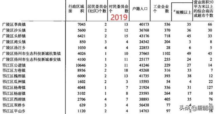 江都区樊川镇668,44,312 江都区仙女镇2652,126,238 江都区丁伙镇545,34,120 邗江区杨寿镇358,34,114 江都区邵伯镇760,28,98 江都区真武镇401,33,80 邗江区西湖镇466,37,78 广陵区李典镇526,36,66 江都区大桥镇849,77,57 江都区小纪镇1430,55,48 广陵区扬州市生态科技新城杭集镇1102,51,48 江都区郭村镇450,34,35 江都区武坚镇562,32,34 广陵区头桥镇700,52,34 江都区丁沟镇420,34,28 邗江区方巷镇386,38,25 江都区宜陵镇815,49,23 邗江区双桥乡68,4,23 邗江区瓜洲镇54,4,22 江都区浦头镇658,18,20邗江区公道镇232,27,20 广陵区沙头镇239,22,18 邗江区槐泗镇325,38,17 邗江区平山乡117,3,16 江都区吴桥镇179,21,10邗江区杨庙镇280,21,10 广陵区湾头镇80,2,8 邗江区城北乡1,1,5 广陵区汤汪乡32,2,5 广陵区扬州市生态科技新城泰安镇246,24,3可以与下面的2019年度数据进行对比,了解各镇2019-2020年度的变迁。