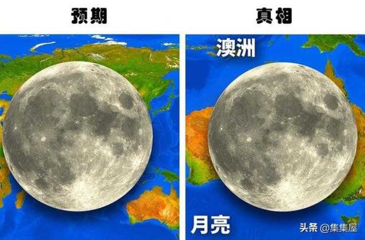 虽然对于我们来说,高高挂在天空中的月球必定是庞然大物,但事实上,月球在地球面前并不大。就拿澳大利亚的国土直径来说,它其实要比月球大600公里。月亮的直径为3400公里,而澳大利亚从东到西的直径几乎为4000公里。当然,月亮作为一个球体,具有更大的表面尺寸,但这个对比仍然非常惊人。