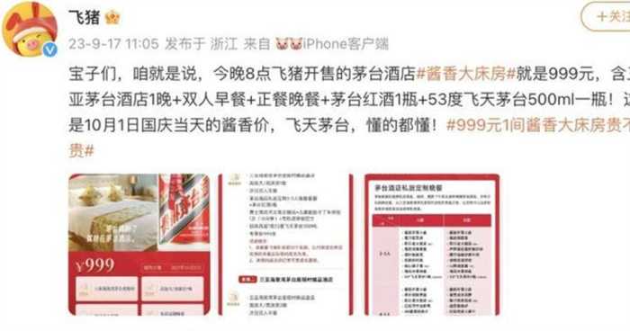 在2023年9月16日,阿里巴巴旗下的飞猪平台正式宣布将会和茅台达成合作,共同推出一款价值999元人民币的酱香大床房套餐,只需要999元就可以选择入住到三亚地区的茅台大酒店,而且还可以品尝一瓶价值1499元人民币的酱香茅台,这瓶茅台的实际市场价格已经超过了3000元人民币。