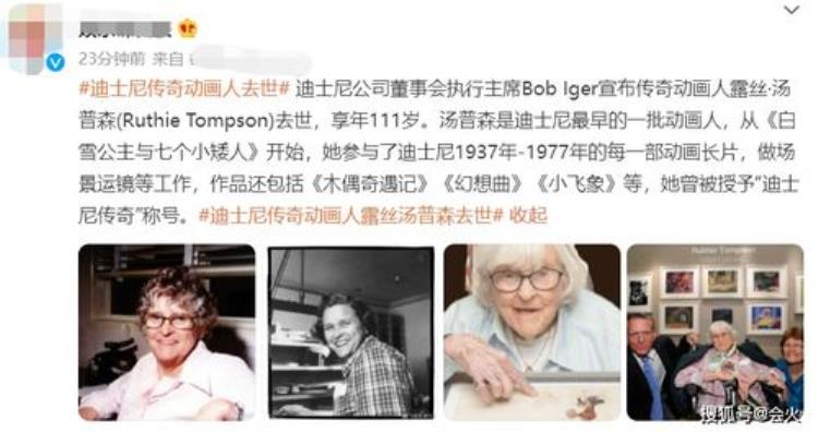 迪士尼的传奇动画人露丝·汤普森去世,这位世纪老人享年111岁。露丝·汤普森去世消息传出后,很多人都表示惋惜,她讲永远活在迪士尼的动画中,一直传承着她的微笑和幽默。