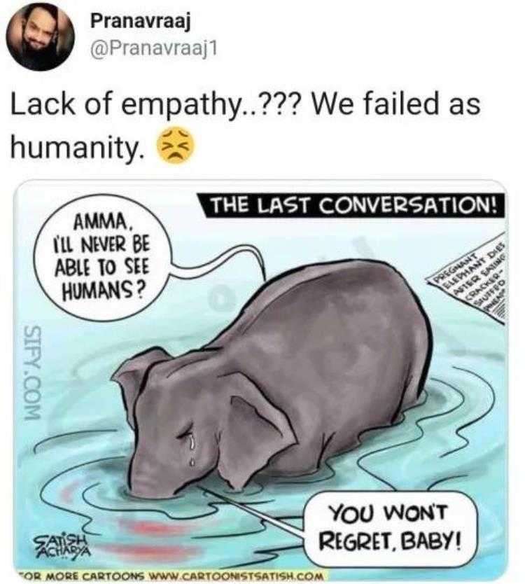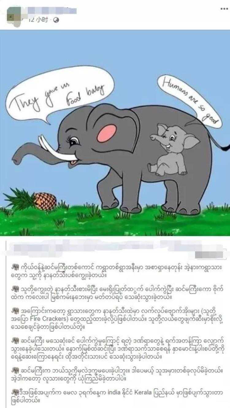过程中,母象应该是被一些不怀好意的村民,投喂了夹带有爆竹的菠萝,导致整个口腔被严重炸伤。印度有网友称:“当菠萝在它的嘴里爆炸时,它肯定感到很震惊,它很可能没有在想自己遭受的痛苦,而是在想肚子里的胎儿。”
