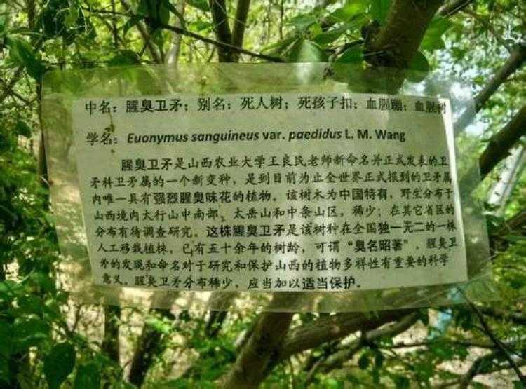 这种死人树是全世界卫矛科的植物当中唯一一种有鱼腥臭气的树木了。所以属于稀有品种。山西农业大学的一位老师当年就尝试栽培这种树木,培育成功之后一棵送给了学校。现今养在山西农业大学的校园里。