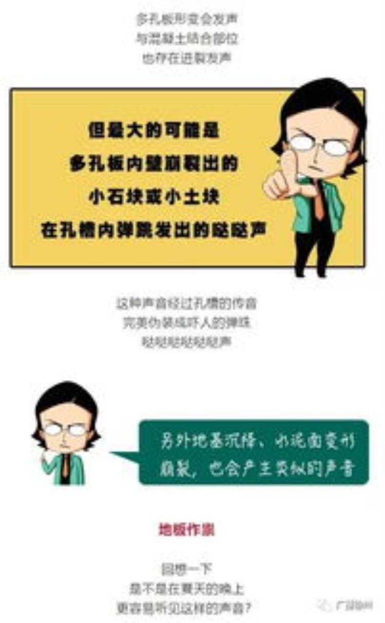 还有一些房子会采用多孔板设计,也就是常说的带孔的预制板,长时间受到重力或者挤压,多孔板里面就有可能迸裂出小石块,这时候小石块在孔里跳动就会发出弹珠一样的声音。