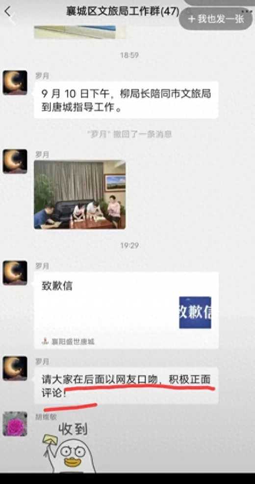 但是领导知道文旅局过来调查就开始怂了,开始在工作群表示,致歉信已发出,要求大家在后面以网友的口吻,积极正面评论。