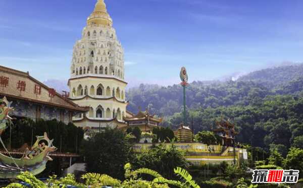 寺庙有许多佛教相关的图标,这是一个融合了中国、泰国和马来西亚风格的建筑,是马来西亚和东南亚独特的文化和宗教特色之一。寺庙为游客们提供了壮丽的景色,庙宇建筑群还有一个独具特色的大铃铛。