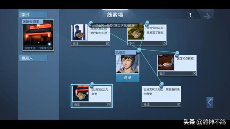 第四步,按照提示,找到侦探事务所的位置(361.452),进去后跟侦探对话,做完小游戏,得到线索墙的玩法说明。第五步,回到之前的面馆,开始找线索,先跟流浪汉(532.291)说话,接着在树下(543.288)和面馆的桌子上(539.283分别找到泥巴的痕迹。打开异闻界面的线索墙,把所有的线索跟流浪汉连在一起,点确定,就会出现新的嫌疑人。