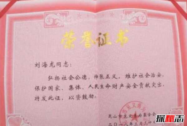 昆山市见义勇为基金会发布情况说明,证实该男子确实曾因帮助警方破案,获得见义勇为证书。该男子名为刘海龙,正是此次事件中主角“龙哥”。据该基金会发文称,2018年3月5日,昆山市陆家派出所接群众刘海龙、张某某举报有人在昆山贩卖毒品。掌握这一情况后,陆家派出所民警会同市公安局禁毒大队展开侦查,为成功抓获贩毒嫌疑人,刘海龙积极配合警方行动,一举将贩毒嫌疑人甄某抓获,后甄某被依法刑拘。
