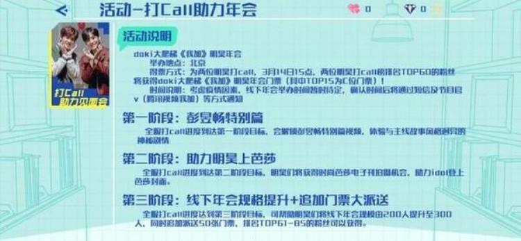 还可以为喜欢的明昊打CALL。打CALL活动分为三个阶段,全员打CALL数量累计到一定数量就可以解锁全新内容以及线下活动。边和爱豆玩角色扮演还能边为爱豆和自己谋福利,这样的综艺爱了爱了。