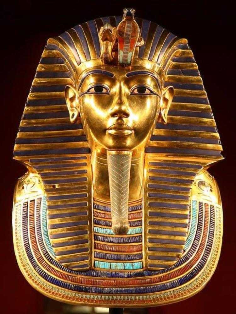 这个黄金面具发掘于埃及法老图坦卡蒙的墓中,是三千多年前的文物。面具由金箔制成,嵌有宝石和彩色玻璃。前额部分饰有鹰神和眼镜蛇神,象征上、下埃及(上埃及以神鹰为保护神,下埃及以蛇神为保护神);下面垂着胡须,象征冥神奥西里斯。面具是世界上最精美的艺术珍品之一。除此之外,它还具有重大的历史文化意义,是古埃及文化的象征。